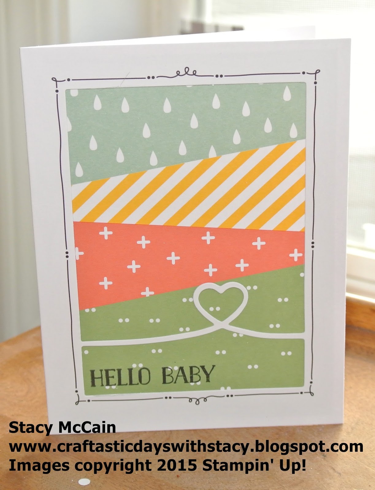 This post is about the multi-striped card in the kit. The instructions have you inserting the striped (pre-printed) paper into the card front. Then you stamp on a small or large banner and adhering it to the front. Then you add a few great gold epoxy hearts and you are done! I did change the ink to be the Memento Black on this vs the Mint Macaroon in the instructions. I was afraid my pad would bite the dust during a class and I like the black as it coordinates with the printed doodle around the card!